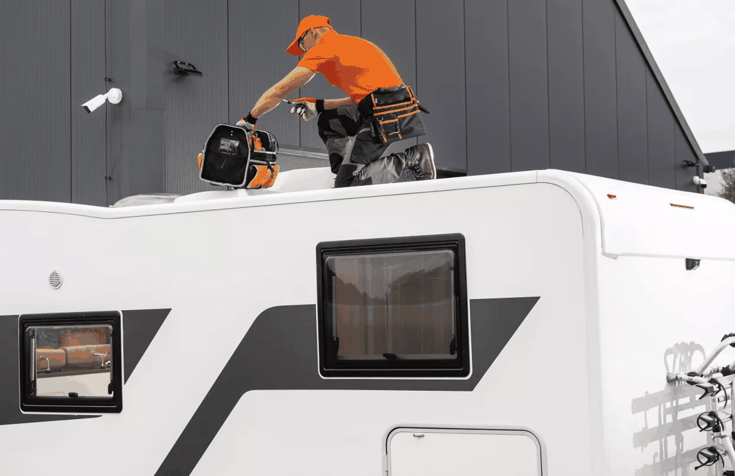 Eine Person trägt Silikondichtstoff von Hand an den Kanten eines Wohnwagens auf. Ein Mann überprüft und ersetzt die Dichtungen des Wohnmobils.